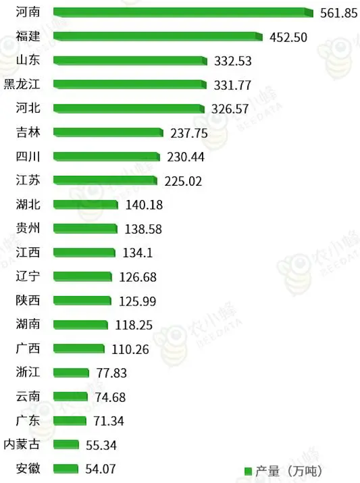 2021年產量在300萬噸以下、100萬噸以上的有10個省:吉林省(231.12萬噸)、四川省(224.56萬噸)、貴州省(210萬噸)、江蘇省(179.80萬噸)、湖北省(146.71萬噸)、江西省(137.81萬噸)、陜西省(129.70萬噸)、遼寧省(128.53萬噸)、湖南省(126.70萬噸)和廣西壯族自治區(100.98萬噸)。