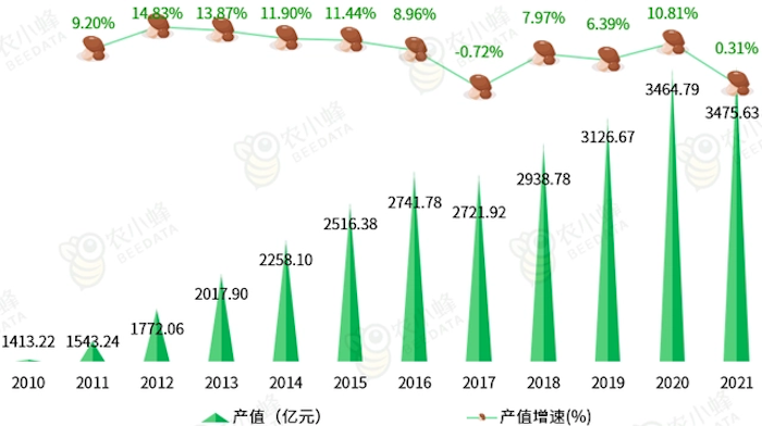 我國食用菌市場總產值隨著食用菌產量的提升也整體呈正增長態勢,僅2017年小幅下滑。據中國食用菌協會統計調查數據顯示,2010~2021年,全國食用菌總產值由1413.22億元增長至2021年的3475.63億元,近11年間增量約2062.41億元、增幅約145.17%、年均復合增長率約9.38%——整體增速明顯高于產量增速。
