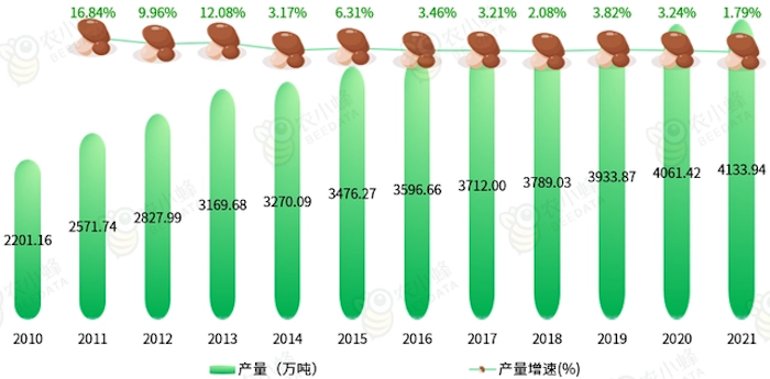 隨著科學技術研究的不斷深入,食用菌栽培技術不斷進步,同時,由于消費者需求的結構升級,越來越多的食用菌實現了工廠化、商業化栽培,并進入消費市場,近年來,我國食用菌產量不斷增加。據中國食用菌協會統計調查數據顯示,2010~2021年,中國食用菌總產量由2201.16萬噸增長至2021的4133.94萬噸,11年間增量達1932.78萬噸、增幅約87.81%、年均復合增長率約5.89%。