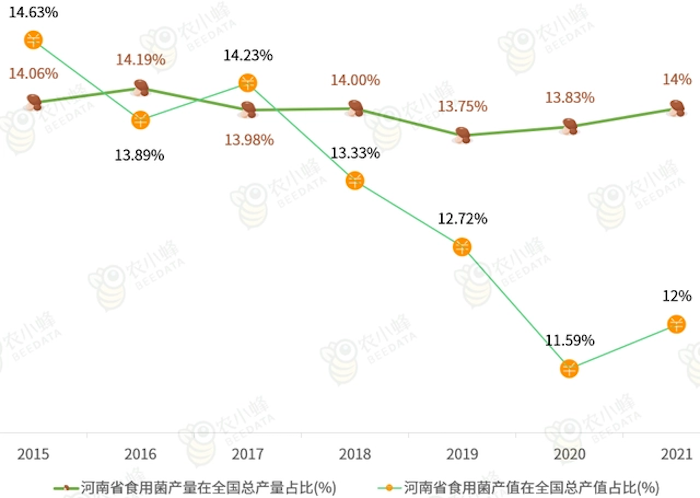 河南具有自然資源、生產成本的優勢,在相關政策和科研創新的推動下,近年來,河南省成為了中國最大的食用菌生產省,隨著全國食用菌產業格局的發展與變化,雖然河南省食用菌產量、產值在全國比重均整體呈下降趨勢,但截至2021年,河南省食用菌產量占全國比重仍然在14%左右,產值比重仍然在10%以上。