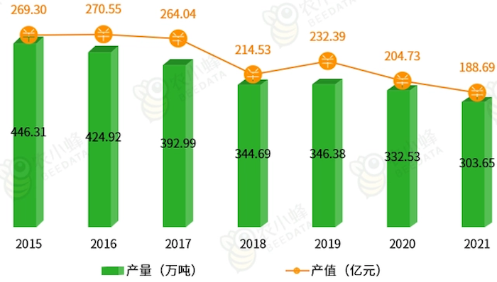 2021年,山東省食用菌產量303.65萬噸,同比減少28.88萬噸,降幅為8.69%,與2015年的446.31萬噸相比,近6年間減少約142.66萬噸,降幅約31.96%;產值188.69億元,同比減少16.04億元,降幅為7.83%,與2015年的269.3億元相比,近6年間減少了80.61億元,降幅為29.93%。長期來看,山東省食用菌年產量維持在300萬噸左右,年產值保持200億元左右發展。綜合來看,2015年至今,山東省食用菌年產量和產值整體呈下降趨勢,僅2019年出現過小幅的回升。