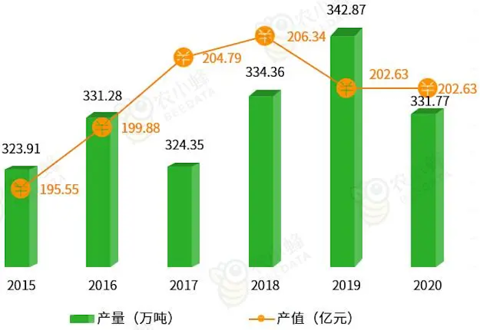 2020年黑龍江省食用菌栽培規模63萬畝,其中黑木耳栽培規模和產量居全國首位。2020年,黑龍江省食用菌產量331.77萬噸,同比減少11.1萬噸,降幅為3.23%,與2015年的323.91萬噸相比,近6年間增加約7.86萬噸,增幅約2.4%;產值202.62億元,與2019年持平,與2015年的195.55億元相比,近6年間增加了7.01億元,增幅為3.61%。
