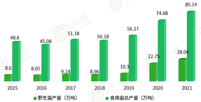 據云南省省食用菌產業發展辦公室統計,2021年,全省食用菌總產量85.14萬噸,總產值324.93億元,云南食用菌總產值全國排名第二位,其中野生食用菌產量28.04萬噸,產值211.13億元;栽培食用菌產量57.1萬噸,農業產值113.8億元。