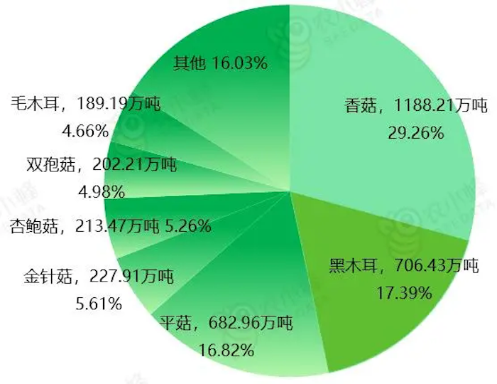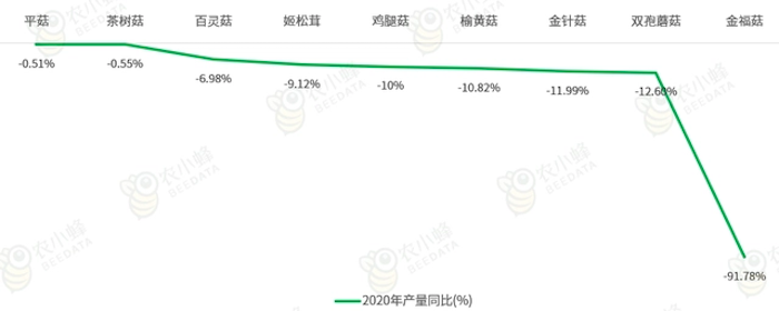 2020年產量減少的有9個品種,分別為:平菇、茶樹菇、白靈菇、姬松茸、雞腿菇、榆黃菇、金針菇、雙抱蘑菇、金福菇。