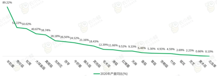 2020年全國大面積和植的食用菌品種中,產量同比增長的有22個品種,分別為:羊肚菌、秀珍菇、松茸、大球蓋菇、真姬菇、灰樹花、獲苓、牛肝菌、猴頭菇、其他菇、毛木耳、滑菇、紅椎菌、天麻、香菇、草菇、杏鮑菇、竹蓀、銀耳、靈芝、黑木耳、北蟲草。