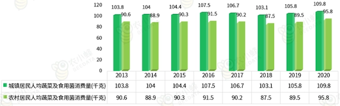 細分消費群體來看,中國城鄉居民人均蔬菜及食用菌消費量還是有一定差距,城鎮居民人均蔬菜及食用菌消費量常年高于農村居民。最新數據顯示,2020年中國城鎮居民人均蔬菜及食用菌消費量109.8千克,較農村居民人均蔬菜及食用菌消費量(95.8千克)高出14千克。