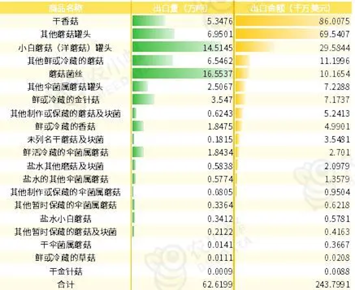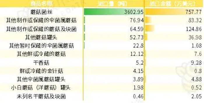 3. 從生產品類來看,2020年我國食用菌年產量超100萬噸的種類依次是:香菇(1188.21萬噸)、黑木耳(706.43萬噸)、平菇(682.96萬噸)、金針菇(227.91萬噸)、杏鮑菇(213.47萬噸)、雙孢菇(202.21萬噸)、毛木耳(189.19萬噸)——這7種食用菌2020年產量總和占全國食用菌總產量的83.97%。食用菌上市企業有眾興菌業、雪榕生物、華綠生物和萬辰生物。在出口方面,進口量較大的食用菌相關商品名稱為“蘑菇菌絲”、“其他蘑菇罐頭”、“其他制作或保藏的蘑菇及塊菌”。出口量較大的食用菌相關商品名稱為“干香菇”、“其他蘑菇罐頭”、“小白蘑菇(洋蘑菇)罐頭”。